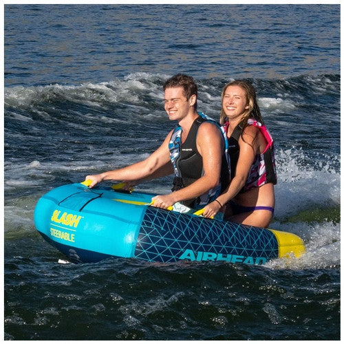 Take control of your ride with the Airhead Slash Steerable Tube! The Slash is a unique steerable tube complete with fins and a patented design that gives riders the power to steer by simply leaning in the direction they want to move. The Slash features an open back shape that was designed to make re-boarding from the water easy. Enforced with a rugged 840 denier double-stitched nylon over, this tube is ridged and easily responsive to the rider's steering commands. The Slash is equipped with Airhead's Speed Safety Valve for quick and easy inflation/deflation and a Kwik-Connect tow point that makes it easy to attach your tow rope.