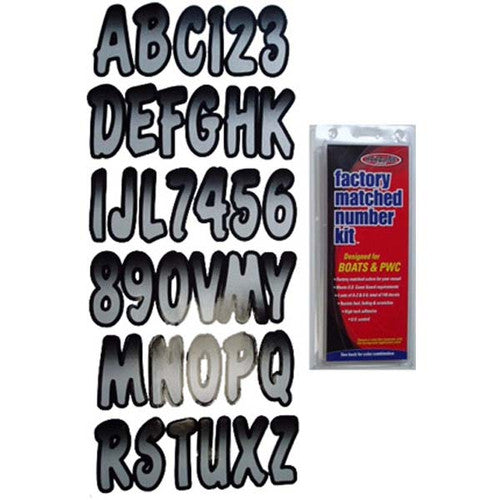 This 3" Boat Letter and Number Kit - Silver and Black features an airbrush blend from one color to the next color. The outline color of the boat lettering shades into the body color for a custom painted look. This kit includes 4 sets of the letters A-Z and the numbers 0-9 making a total of 146 boat decals. These letters are UV coated for protection from the sun and they can be used on boats or personal watercraft. Fuel, fade and scratch resistant, this boat lettering and boat number kit is made from 4 mil outdoor vinyl with super-stick adhesive.